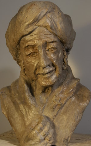 A middle aged man wears a turban and is dressed in a coat with a high collar. Jewish sidelocks (“peyes”) come from underneath the turban. On his left lapel he wears a Christian cross. Three rings adorn his fingers.